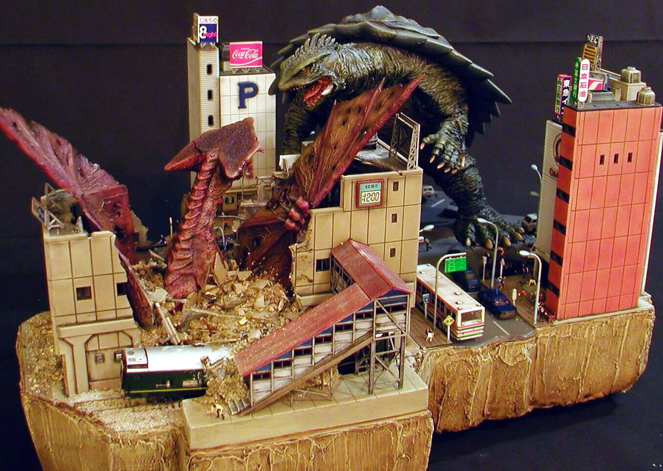 Kaiyodo Gamera sculpted by Yuji Sakai. Gyaos by Bandai. N scale custom diorama. Article for Amazing Figure Modeler #30.