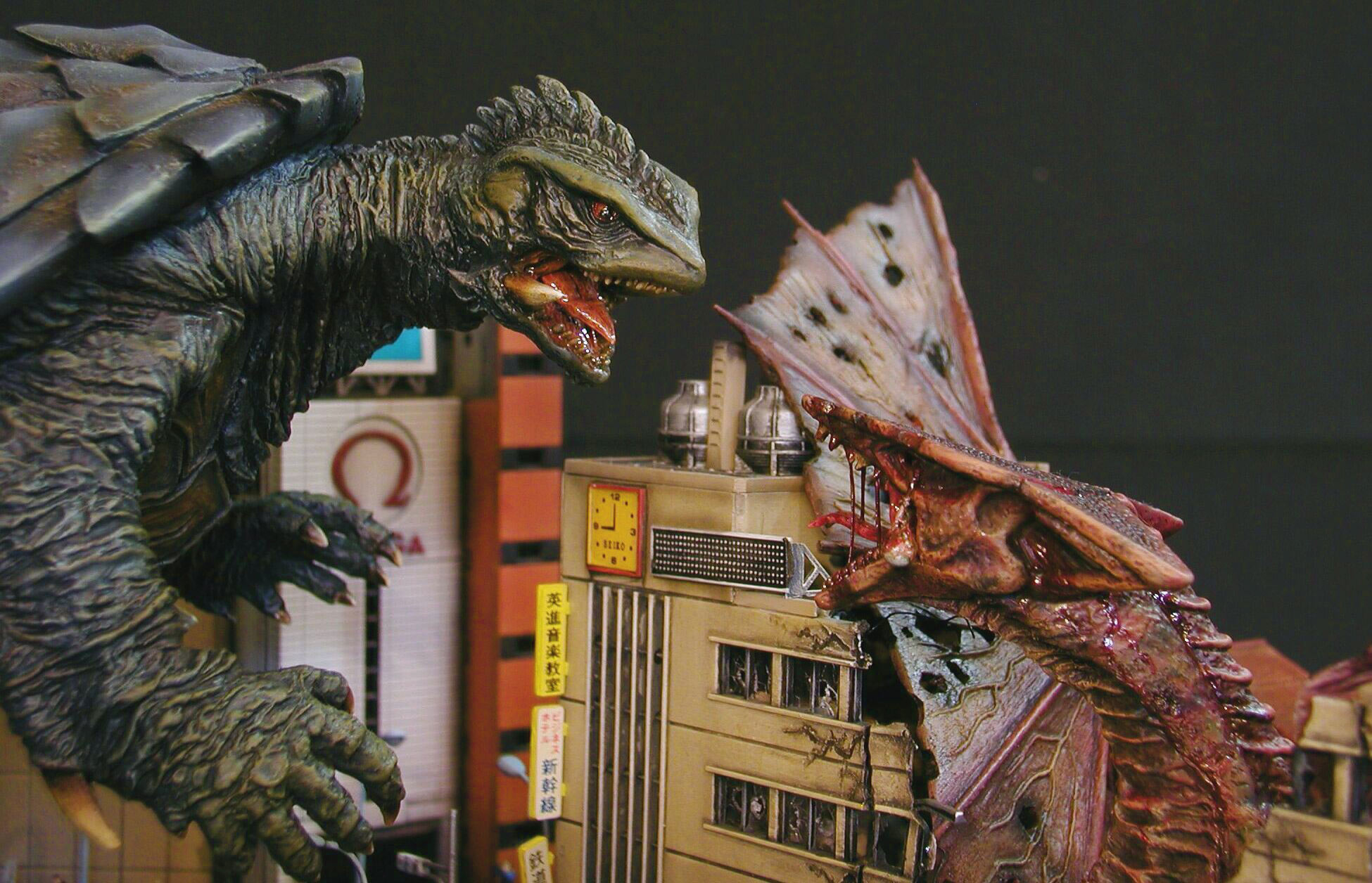 Kaiyodo Gamera sculpted by Yuji Sakai. Gyaos by Bandai. N scale custom diorama. Article for Amazing Figure Modeler #30.