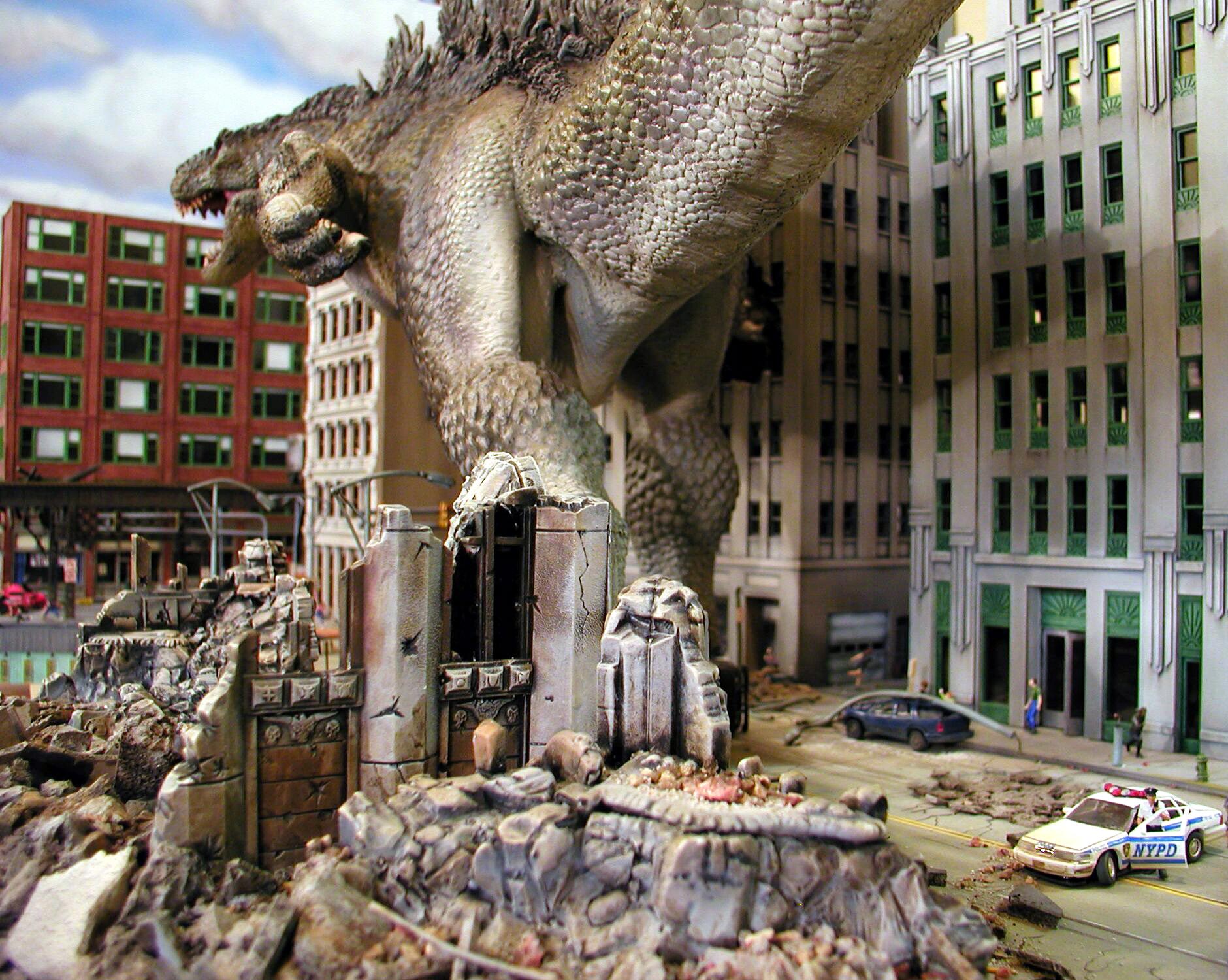 One of my favorite dioramas I've ever created using Needful Things' Delgadosaurus sculpted by Bob Bagy, and HO scale buildings and vehicles.